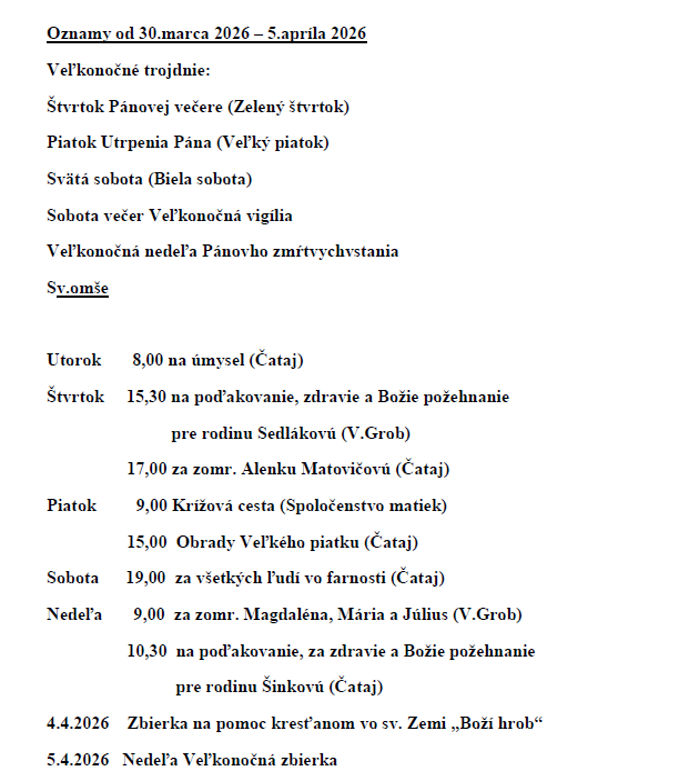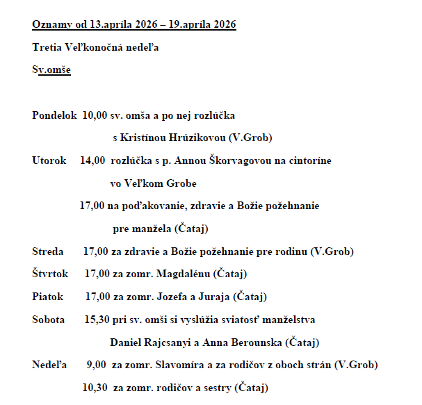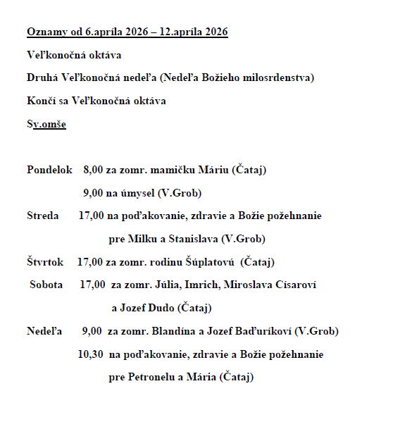 Publikované 6. apríla 2026Autor farnosť ČatajKategórie Farské oznamy