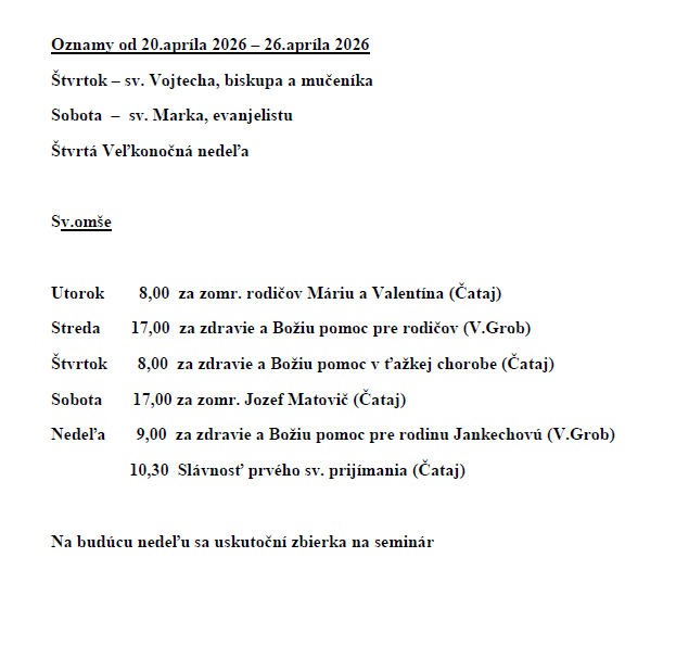 Publikované 19. apríla 202618. apríla 2026Autor farnosť ČatajKategórie Farské oznamy